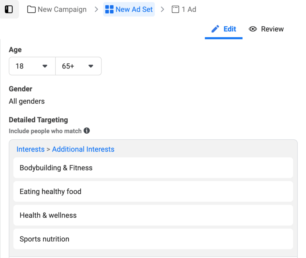 תוכל גם להשקיע בקמפיינים ממומנים ברשתות החברתיות. רוב הפלטפורמות נותנות לך לטרגט אנשים עם תחומי עניין ספציפיים ככה שתוכל להגיע לאנשים שממילא מעוניינים במוצר או השירות שלך. הנה דוגמה לכלי הטירגוט המפורט של פייסבוק: