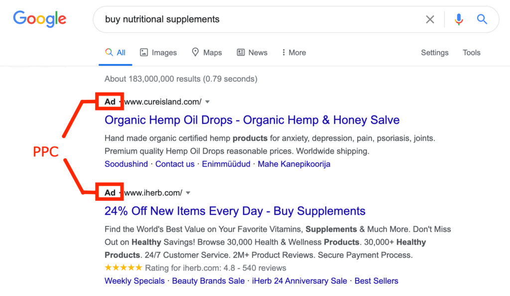 ישנה עוד אפשרות לאסטרטגית שיווק בתשלום, וזו אסטרטגיה מצוינת אם ה-SEO של האתר שלך אינו ברמה גבוהה עדיין. תוכל לשלם לגוגל כדי שיראו את האתר שלך כתוצאה הראשונה כאשר משתמש מחפש משהו שאתה מציע. כנראה שנתקלת במודעות כאלה בעבר: